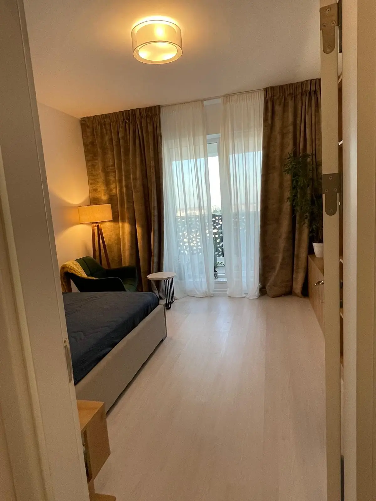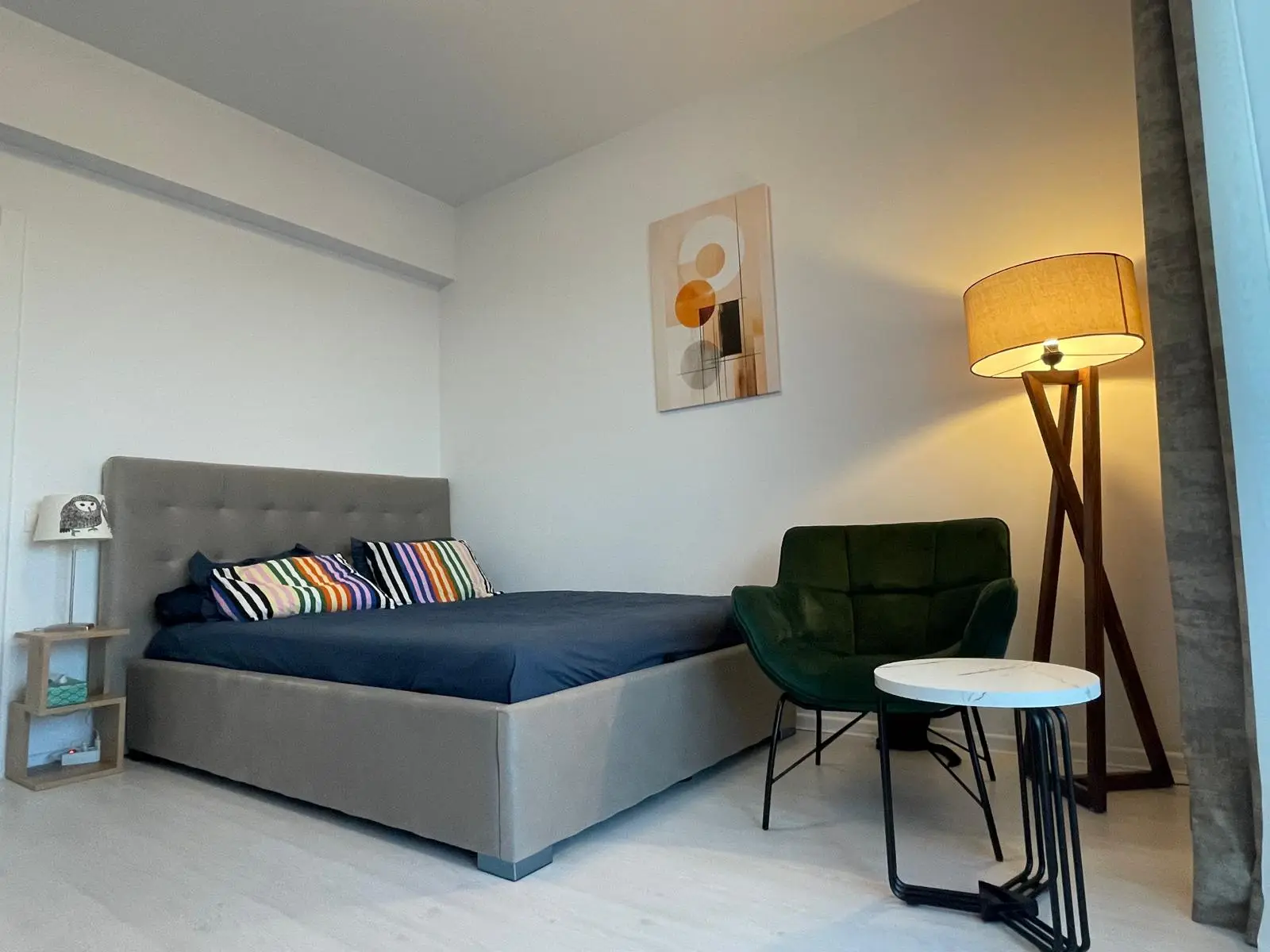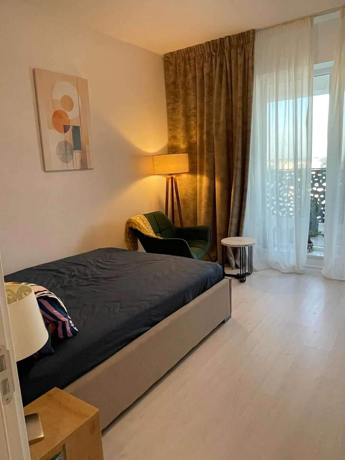 Dormitorul este amenajat într-un stil modern, cu un pat tapițat în nuanțe neutre, completat de noptiere minimaliste și o zonă de relaxare cu un fotoliu elegant din catifea verde. Lampa de podea, cu structură din lemn masiv, adaugă un aer sofisticat, iar decorul peretelui contribuie la o atmosferă armonioasă. Dressingul înalt, cu finisaj mat și mânere elegante negre, oferă spațiu generos pentru depozitare, menținând ordinea și rafinamentul camerei.